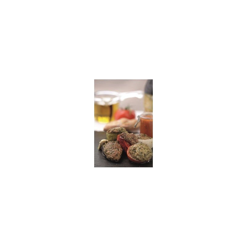 Tomates, oignons, aubergines, courgettes et poivrons sont les légumes farcis de la Maison Perrin, avec une farce à base de viande de boeuf et viande de porc.